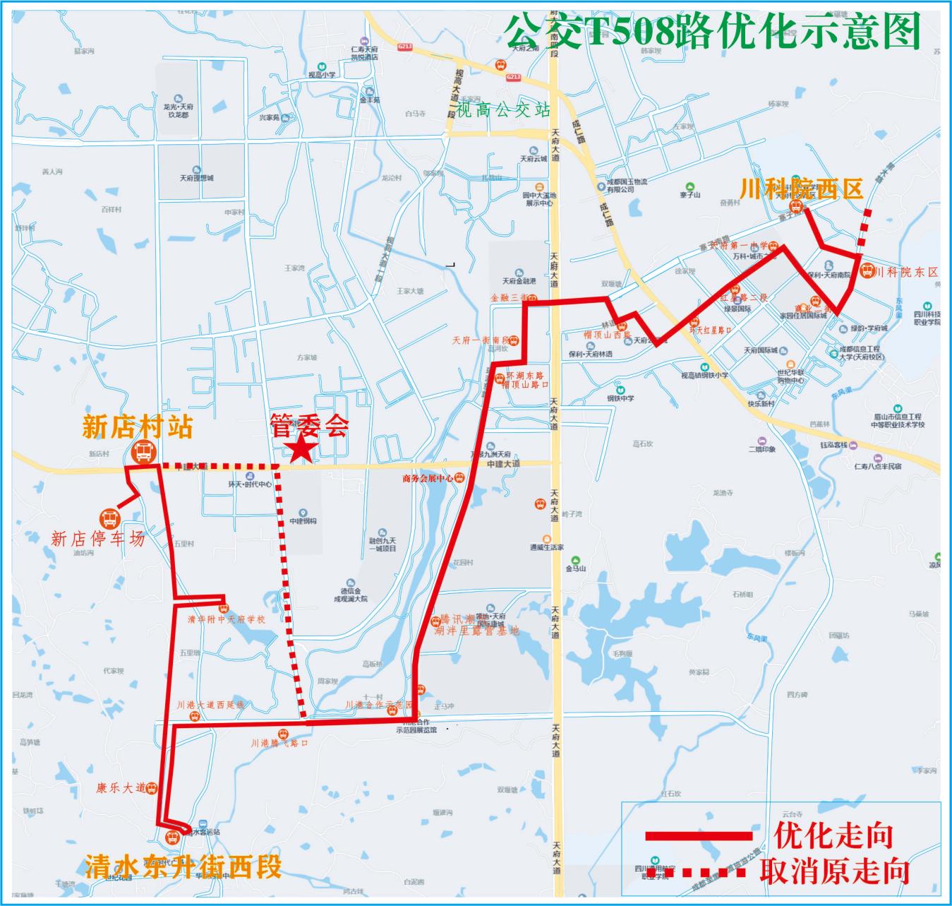 調(diào)整走向:取消途經(jīng)商業(yè)二街,調(diào)整途經(jīng)學府路覆蓋川科院西校區(qū)和天府三幼至眉山天府新區(qū)托育中心。
